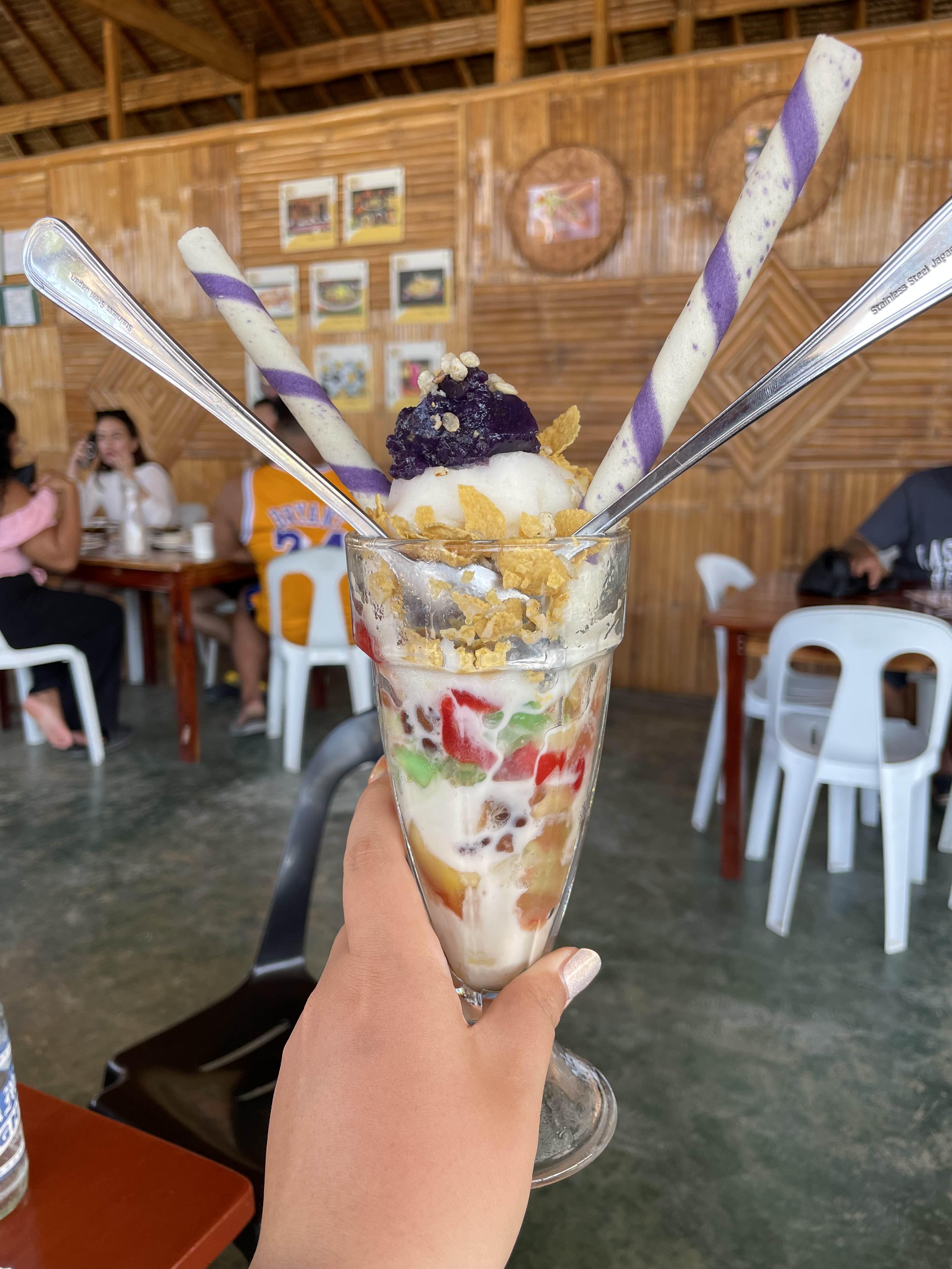 또 필리핀 가면 먹어봐야 된다고 해서 후식으로 시켜본 '할로할로'. 생각보다 엄청 달진 않았고 젤리라기보단 양갱에 가까운 달달한 것과 팥, 과일이 이것저것 들어있어서 골라 먹는 재미가 있음. 입맛에 맞는 게 입에 들어오면 럭키!! 다른 데서도 먹어봤는데 집집마다 조금씩 스타일은 다른듯하다. 나는 옆에 '밀라스 레스토랑 Mila'x Restaurant'에서 먹었던 게 더 맛있었음ㅋㅋ