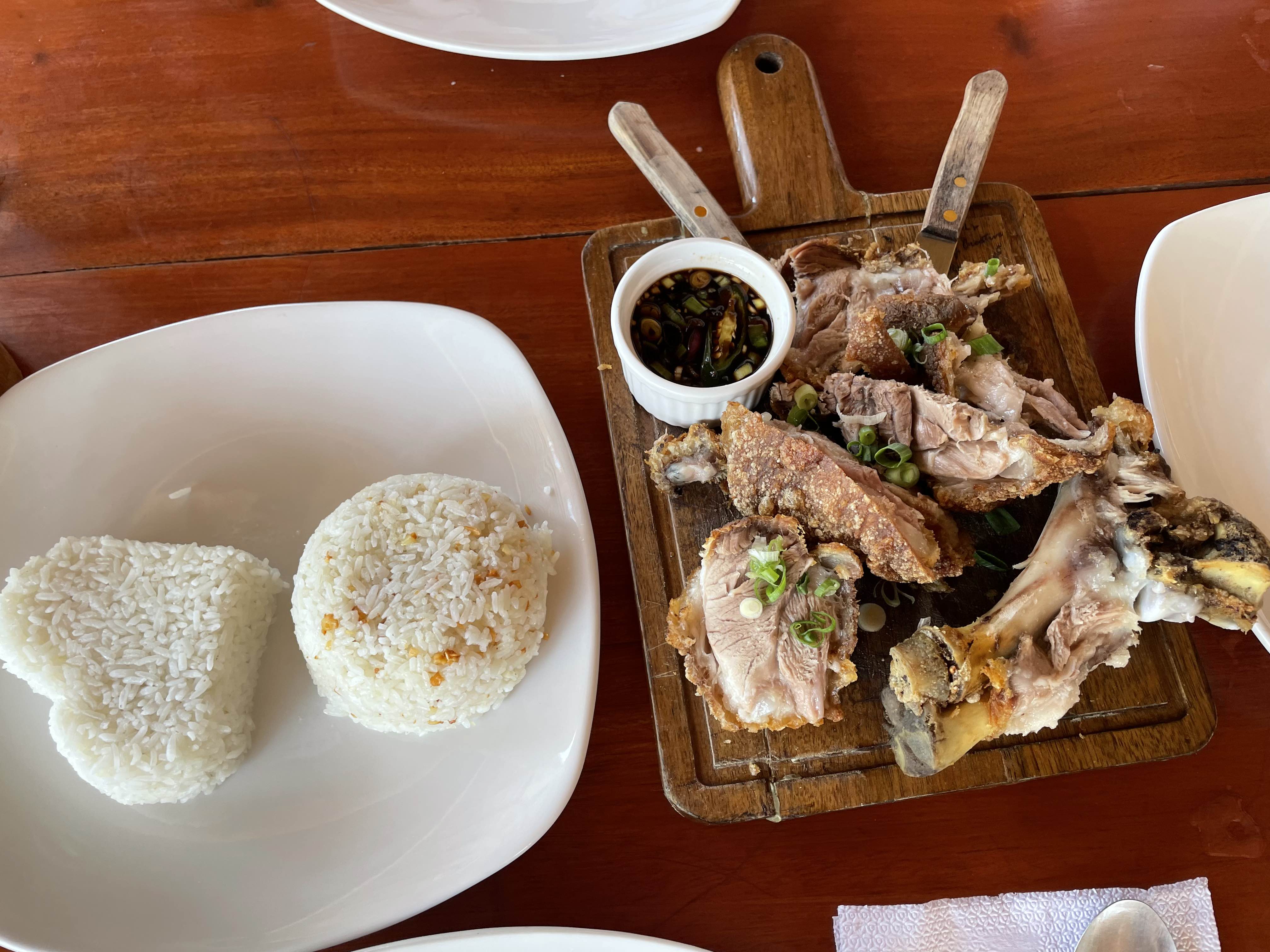 밥은 둘 다 찰기 없는 밥인데, 플레인이나 갈릭이나 내 입맛엔 그게 그거였다. 25페소(약 850원) 추가인데, 여기서 두 번째로 갈릭 밥을 먹어보고는 굳이 갈릭 추가의 필요성을 못 느껴서 다른 곳에선 플레인만 주문하기로 결심하게 됐다.