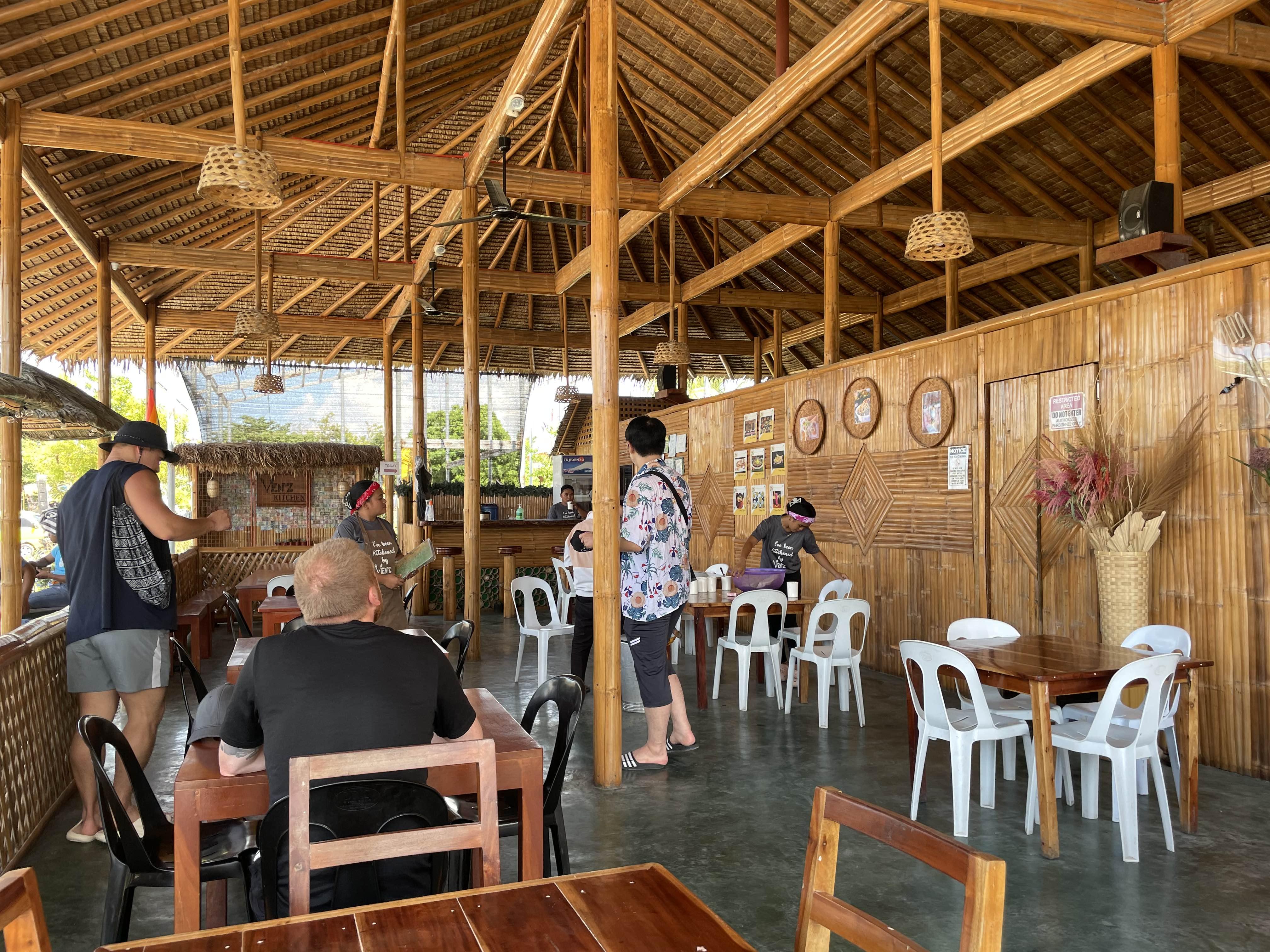 햇빛이 엄청 뜨거웠던 모알보알의 한낮. 15분 정도 걸었는데 땀이 무지하게 났다...... 벤츠 키친은 전체가 야외석이었다. 전체적으로 나무를 사용한 인테리어여서 숲속에 있는 식당에 들어온 기분이 들었다. 다른 사진을 보니까 밤에는 조명이 켜져서 더 분위기 있어 보였다.