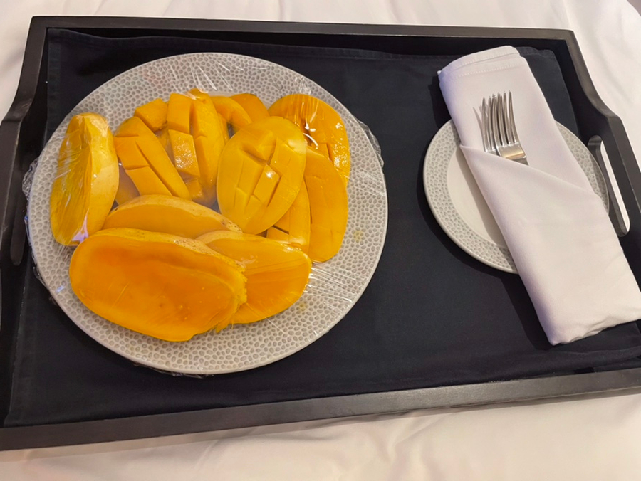 덤터기 쓰고 산 망고지만 그래서 더 소중하게 들고 와서 리조트에 손질을 맡겼는데 이렇게 이쁘게 잘라서 가져다줬다. 가져다준 직원에게 50페소 팁으로 드렸다.