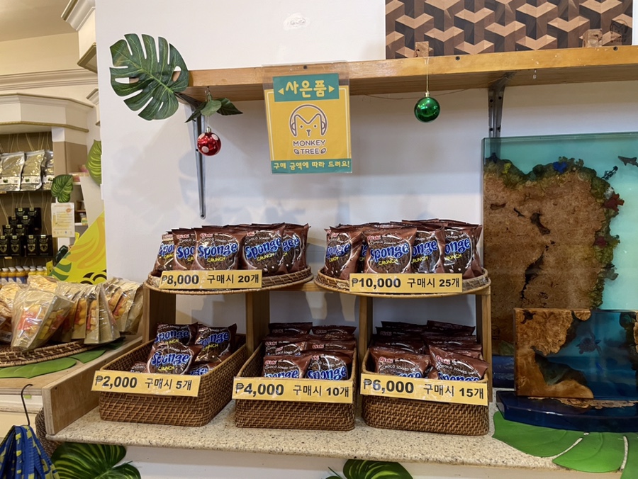 마트에서도 코코넛 칩이나 망고젤리 등 호객행위를 엄청 했다. 많이 사면 몇 개 더 주는 행사 중이었는데, 사야 되는 단위가 20개 이래서 1층의 몽키 트리에 없는 품목만 낱개로 조금씩만 샀다.