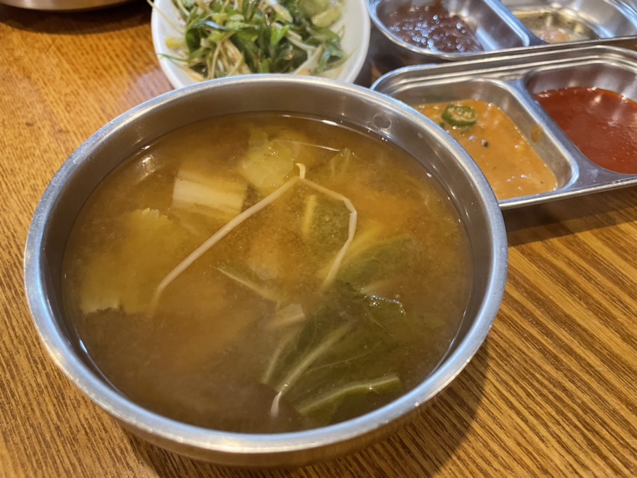 무 쌈, 파절이, 양파 절임 등 밑반찬 역시 한국식으로 깔리고 소스는 개인 접시로 나와서 좋았다. 그리고 메뉴 주문하면 된장국도 인당 한 그릇씩 그리고 리필도 됐음. 아쥬 좋아~~